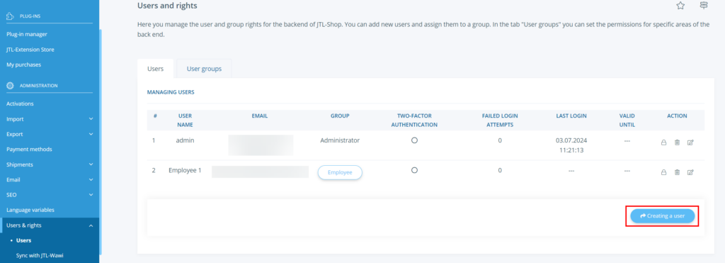 1. In the back end of JTL-Shop, go to Administration > Users & rights > Users to open the Users and rights page.