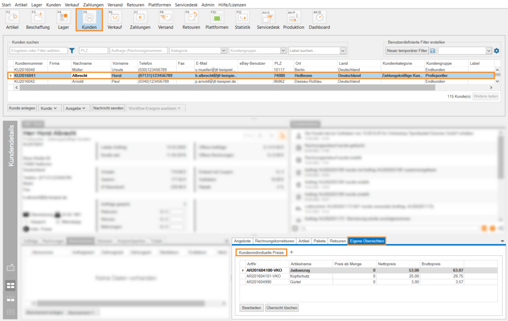 Select a customer in the JTL-Wawi customer management to see all valid customer-specific prices at a glance. Scale prices are also taken into account. The following information is shown: