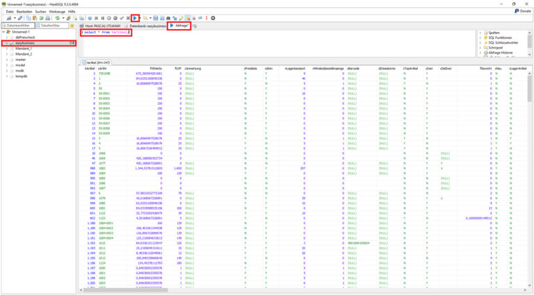 - Select the “eazybusiness” database. Then click Abfrage (Query) and enter the desired SQL query into the editor. Then click on the arrow to run the query (see screenshot).