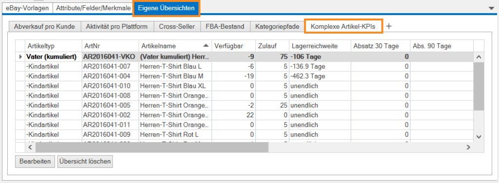 With this custom overview you can see how often the selected item is sold via the different sales channels. Marketplaces via third-party connections, online shop systems and POS cash registers are also considered in the overview. The following information is shown: