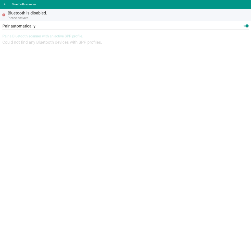 If Bluetooth is enabled, you can use the slider for Pair automatically, to pair your Bluetooth scanners automatically. The function is active when the dot in the slider is on the right.
