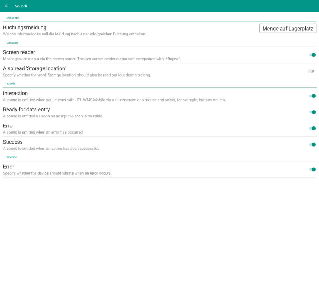 Here you select whether the feedback from JTL-WMS Mobile is output via screen reader and in which cases warning and confirmation sounds should sound.