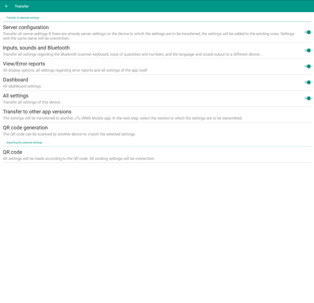 Transfer to other app versions: If you click on this function, you can transfer your settings to another version of JTL-WMS Mobile App.
