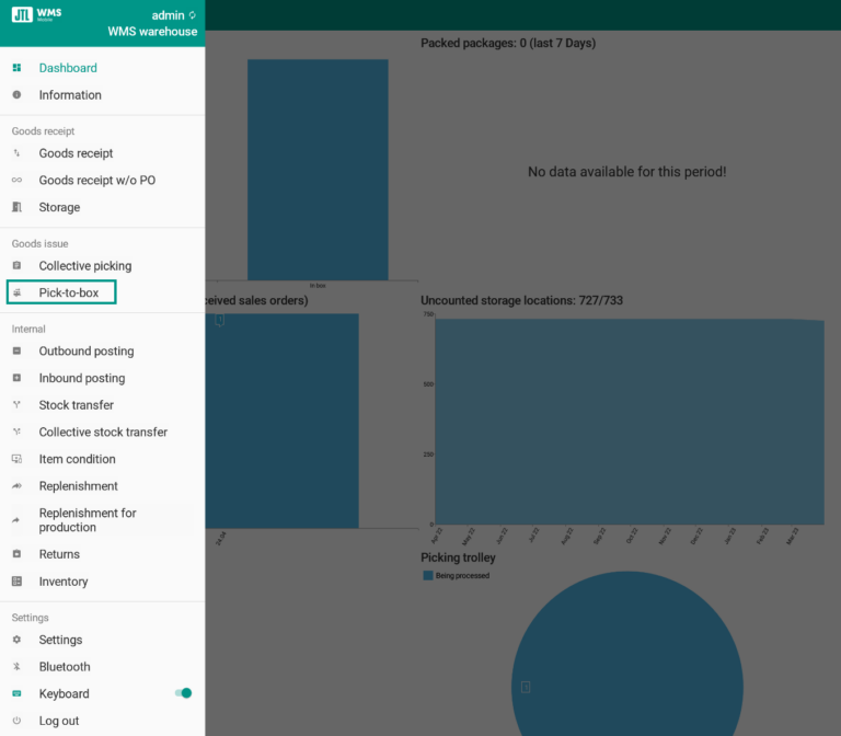 - Open the hamburger menu and select the Pick-to-box menu item.