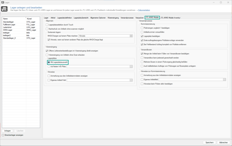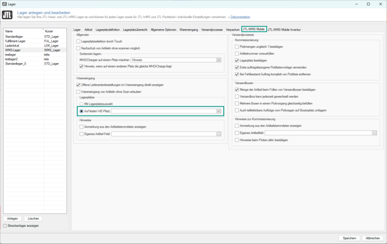 - Start JTL-Wawi and open your warehouse settings via Menu: Warehouses > Warehouse > Tab: JTL-WMS Mobile.