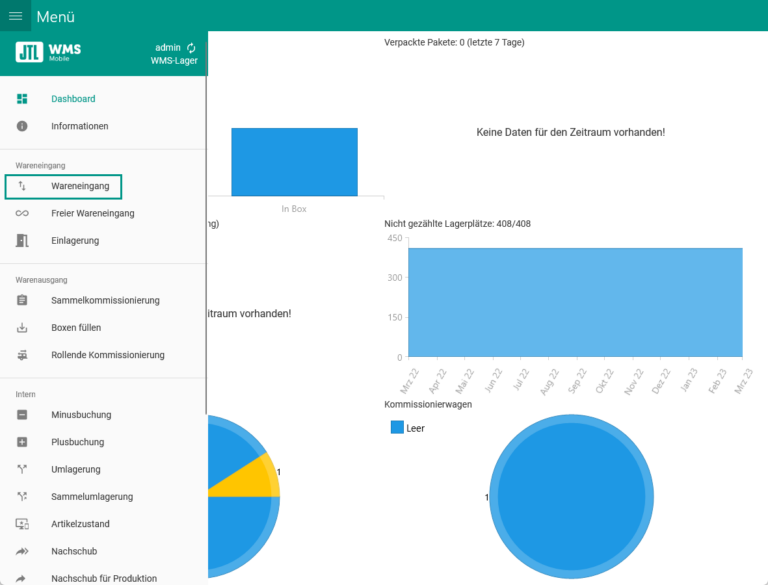 Advantage: You can post the goods to your system with just one operation without intermediate storage. During this process, no additional workstation is required for the goods receipt location. All steps can be carried out with JTL-WMS Mobile, including taking the goods out of the delivery boxes, as well as inspecting, counting and transferring the goods to the storage locations.