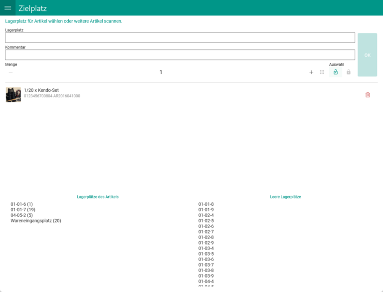 - Scan the storage location or enter the storage location in the input field. The system suggests all storage locations, in which the item is already stored. In addition, the predefined storage locations of the item and other empty locations are displayed. However, in accordance with the random warehousing principle, the item can be posted to any storage location that is not blocked. This depends on your warehouse settings.