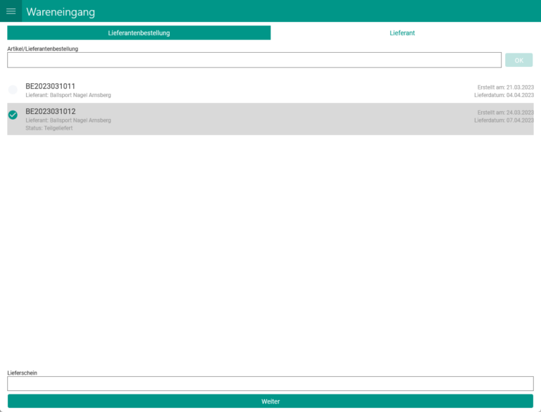 - To select the desired purchase order, select it in the list and click Next. Please note that the items scanned so far have not been posted yet. They are only used to identify the purchase order.