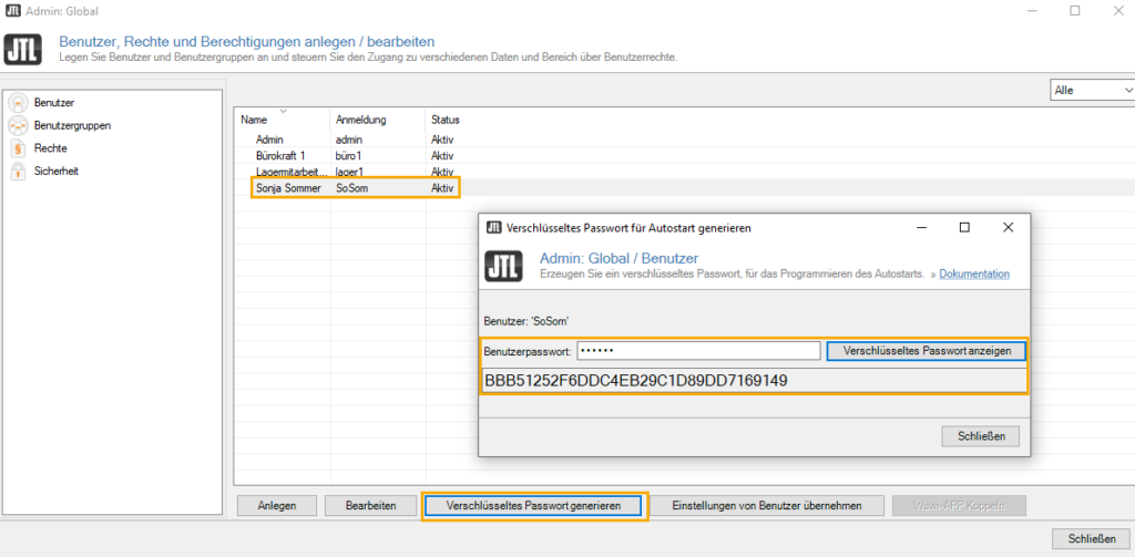 If you want to start various applications, e.g. JTL-Wawi via auto start, you will need an encrypted version of your password. You can easily have the current password encrypted and then use it in the auto start configuration.