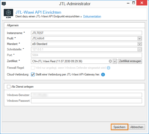 - Gib im Dialogfenster JTL-Wawi API einrichten einen Instanznamen ein.