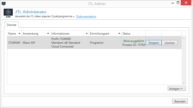 Sobald der Status „Wird ausgeführt“ erscheint, hast du erfolgreich eine Verbindung zwischen JTL-Wawi und JTL Cloud hergestellt.