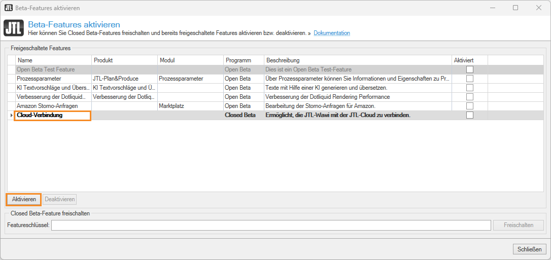 - Öffne über das Menü: Hilfe / JTL-Kundenkonto > Beta-Features das Dialogfenster Beta-Features aktivieren.
