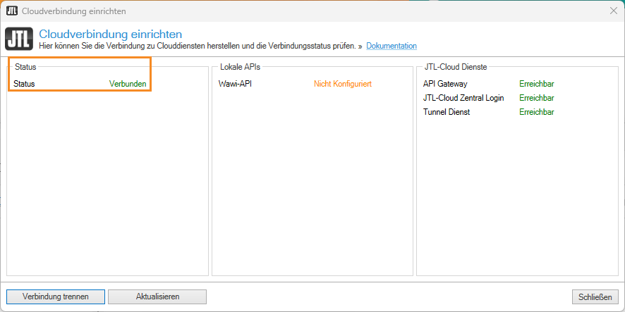 - Du kehrst in das Dialogfenster Cloudverbindung einrichten zurück und siehst im Bereich Status: „Verbunden“.