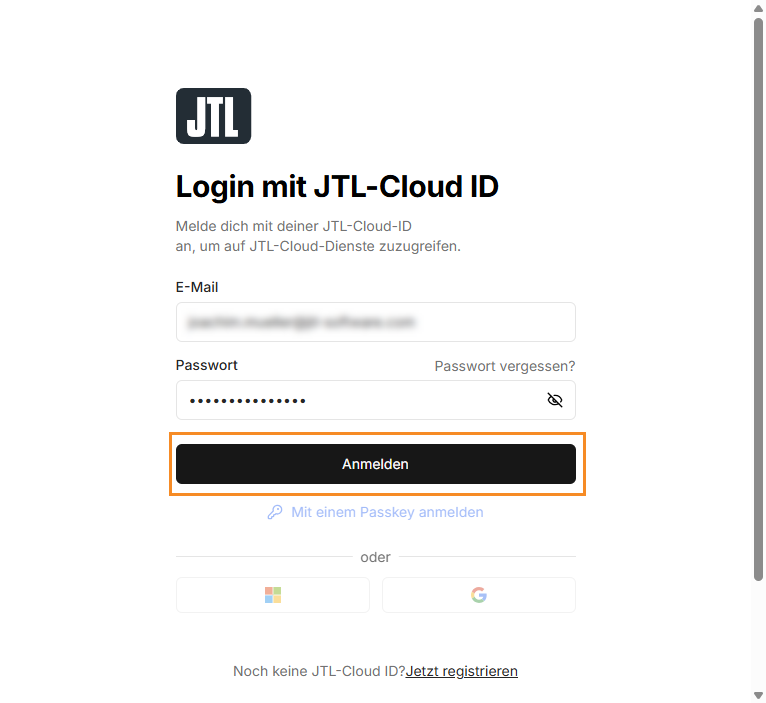 - Gib im Dialogfenster Login mit JTL ID deine Anmeldedaten für JTL Cloud ein.