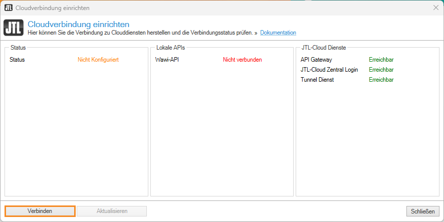 - Öffne über das Menü: Admin > JTL-Cloud Verbindung das Dialogfenster Cloud-Verbindung einrichten.