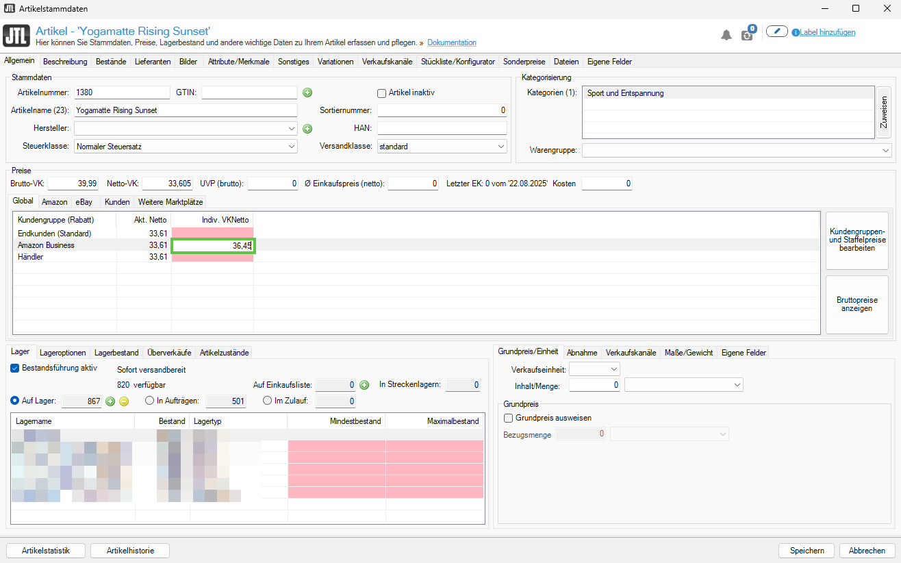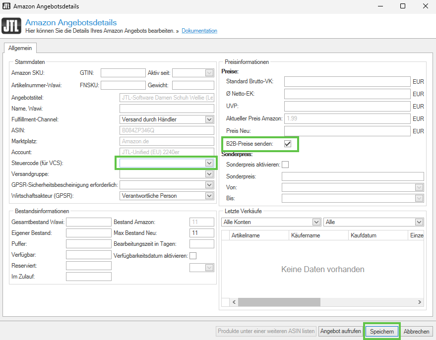 Sie haben dem Amazon-Preistyp für B2B-Angebote die JTL-Wawi-Kundengruppe für Amazon Business zugewiesen. Wenn in den Artikelstammdaten ein Preis für die Kundengruppe gespeichert ist, übermittelt JTL-Wawi automatisch ein B2B-Angebot, wenn Sie Produktdaten übermitteln.