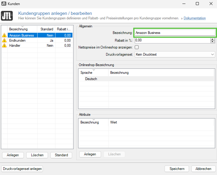 - Erstellen Sie eine Kundengruppe. Nennen Sie diese Kundengruppe zum Beispiel Amazon Business. Siehe Kundengruppen anlegen