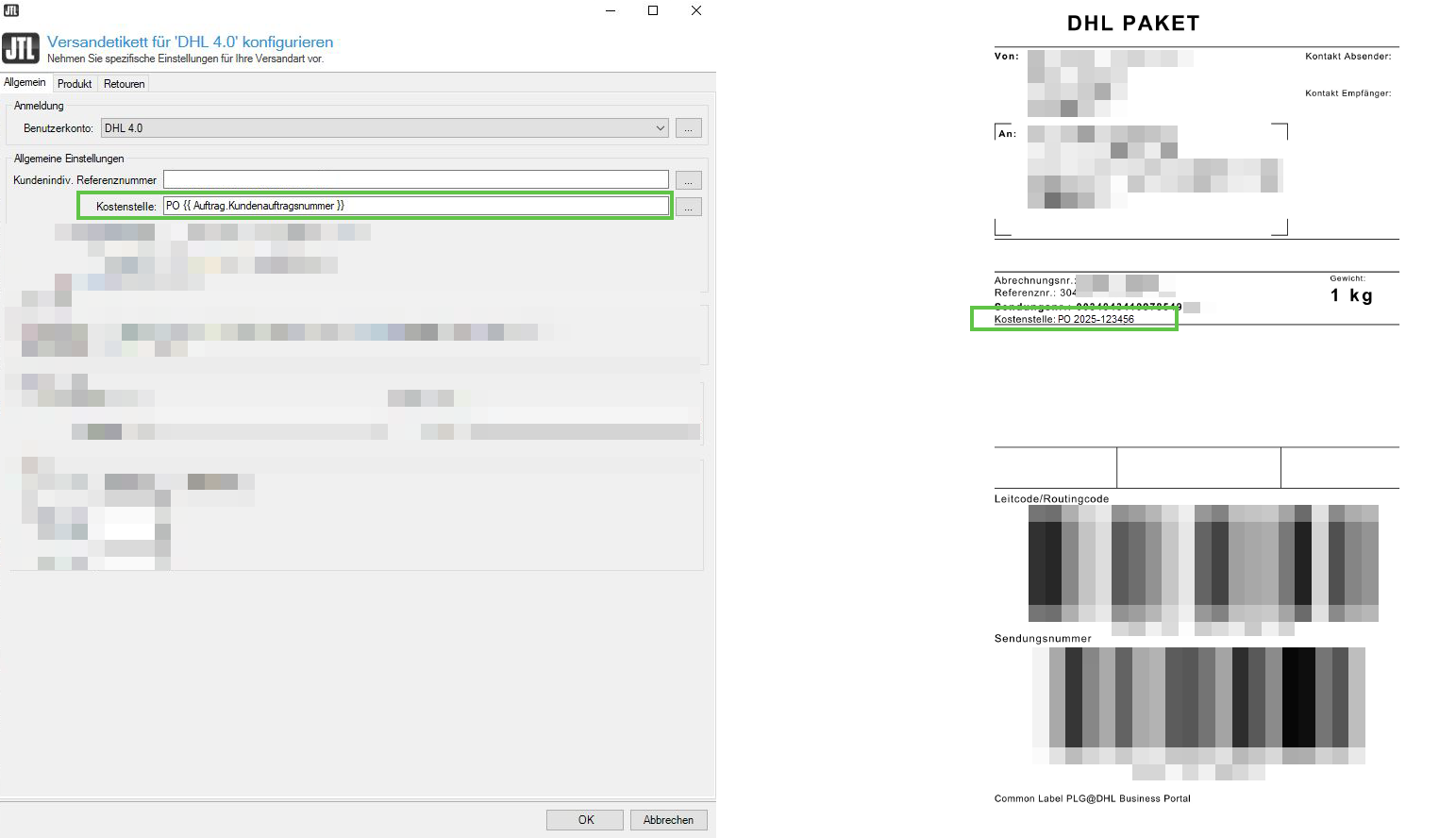 | DHL | Kostenstelle | PO {{ Auftrag.Kundenauftragsnummer }} |