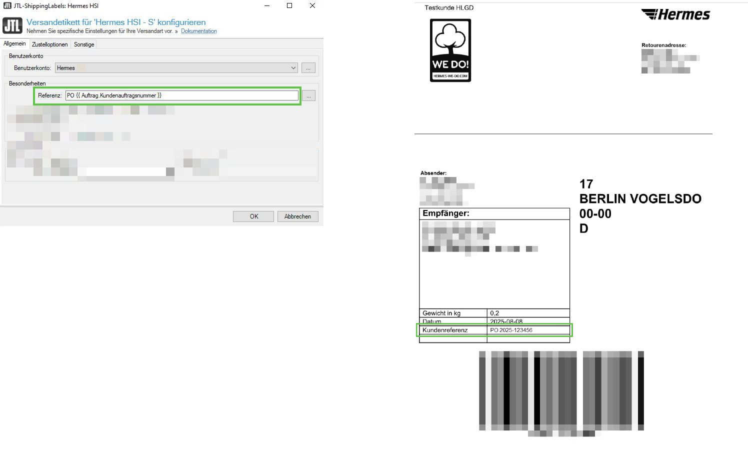 | Hermes HSI | Reference | PO {{ Auftrag.Kundenauftragsnummer }} |