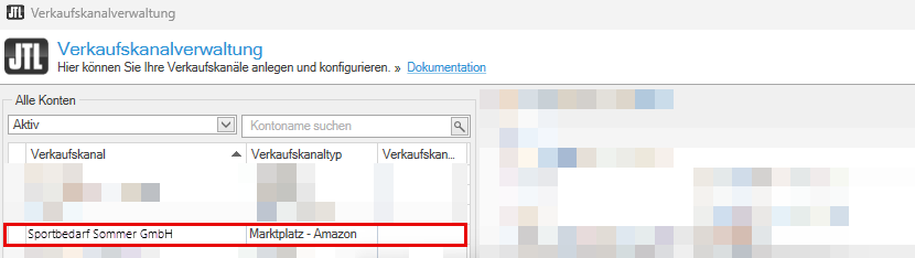 - Sie sehen das Dialogfenster Verkaufskanalverwaltung. Klicken Sie im Bereich Alle Konten auf das Konto des Verkaufskanals für Ihre Amazon-Kontoanbindung.