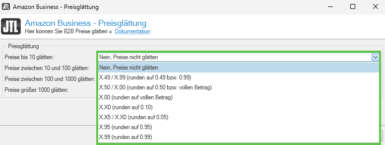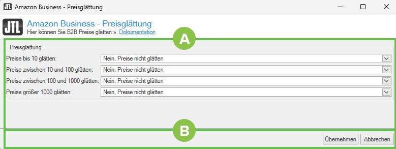 In dieser Dokumentation lesen Sie eine Detailbeschreibung der Funktionen im Dialogfenster Amazon Business – Preisglättung.