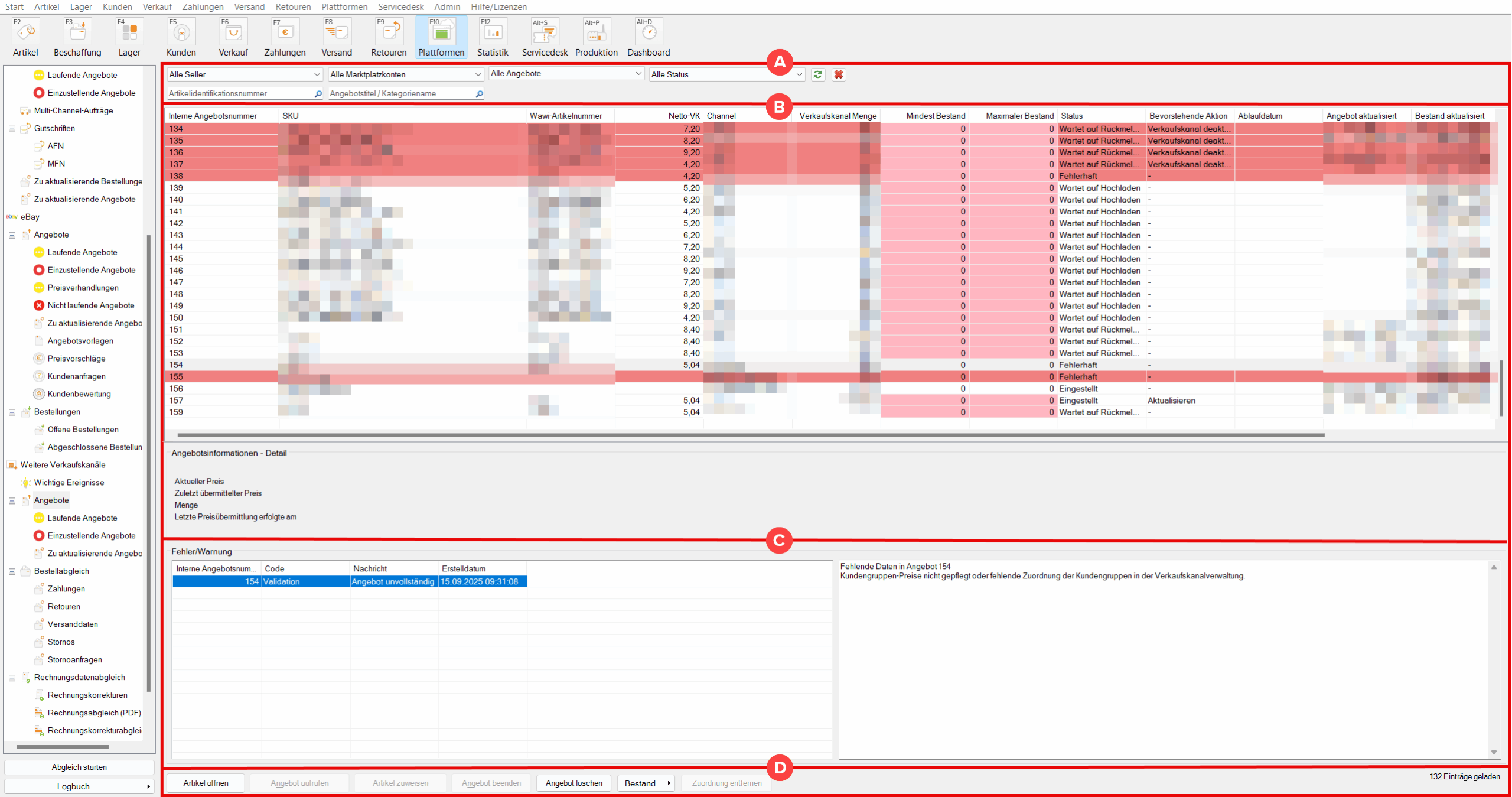 In diesem Bereich sehen Sie die Fehler und/oder Warnungen des Verkaufskanals zu dem Angebot, das Sie in der Liste markiert haben. Wenn Sie auf einen der Einträge in der Tabelle klicken, werden rechts daneben weitere Informationen zu der Nachricht angezeigt.