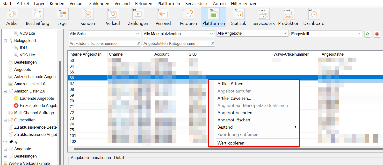 Wenn Sie mit der rechten Maustaste auf ein oder mehrere Angebote in der Liste klicken, sehen Sie ein Kontextmenü mit den folgenden Optionen: