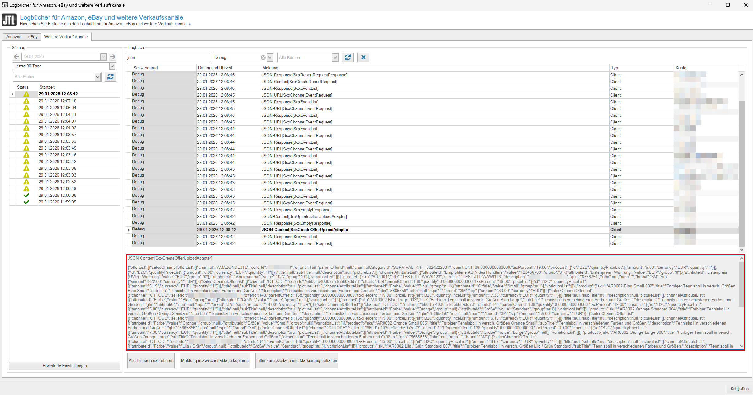Sie haben das erweiterte Logging aktiviert. Für den festgelegten Zeitraum werden im Logbuch bei jedem Abgleich detaillierte Informationen zu den ausgetauschten Daten protokolliert. Siehe auch Logbuch für die weiteren Verkaufskanäle einsehen