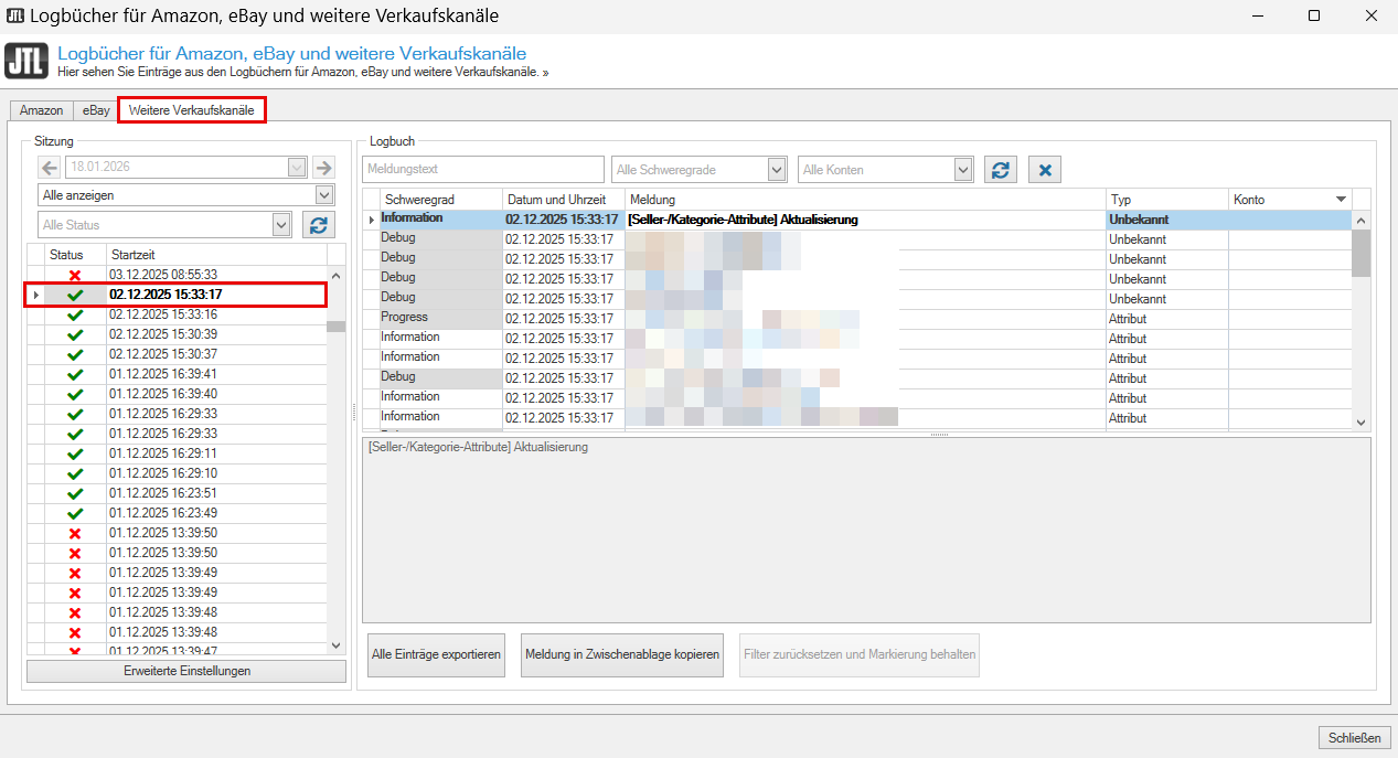 Hinweis: Wenn Sie das erweiterte Logging aktiviert haben, geben Sie in das Feld Meldungstext „json“ ein und stellen Sie den Filter Schweregrad auf Debug. So werden nur die Ergebnisse des erweiterten Loggings angezeigt. Siehe Erweitertes Logging für die weiteren Verkaufskanäle aktivieren