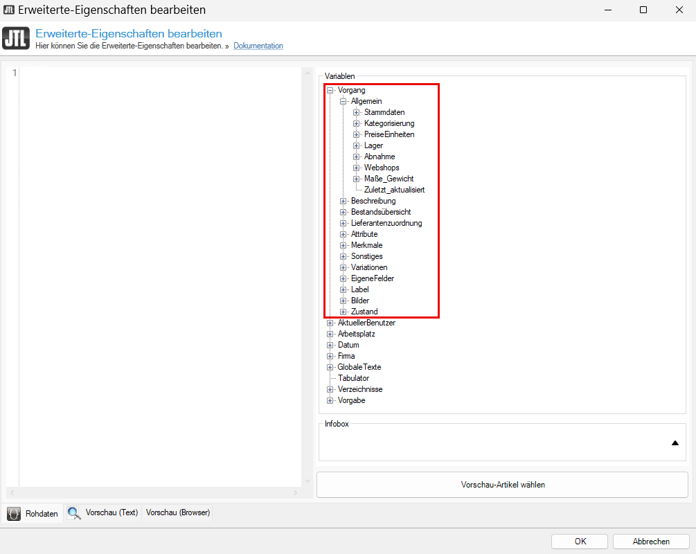 | Bezeichnung in Variablenbaum | Variable | Einstellung in JTL-Wawi |