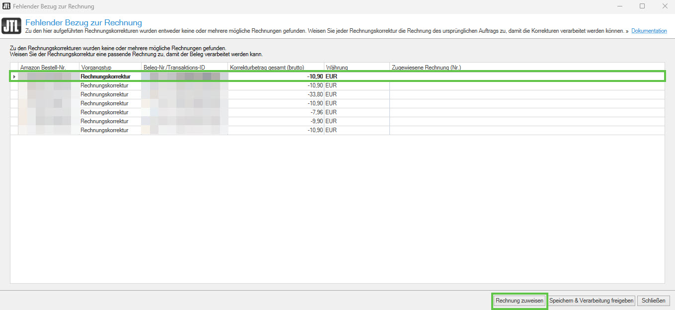 - Weisen Sie allen weiteren Rechnungskorrekturen in der Liste eine Rechnung zu. Wiederholen Sie dazu für jede nicht zugewiesene Rechnungskorrektur die Schritte 5 bis 8.