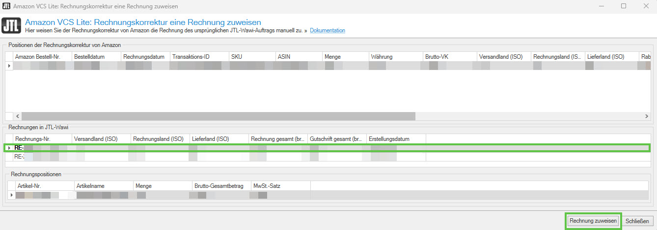Amazon VCS Lite: Rechnungskorrekturen ohne Rechnungsbezug eine Rechnung zuweisen (ab JTL-Wawi 1.10.8)