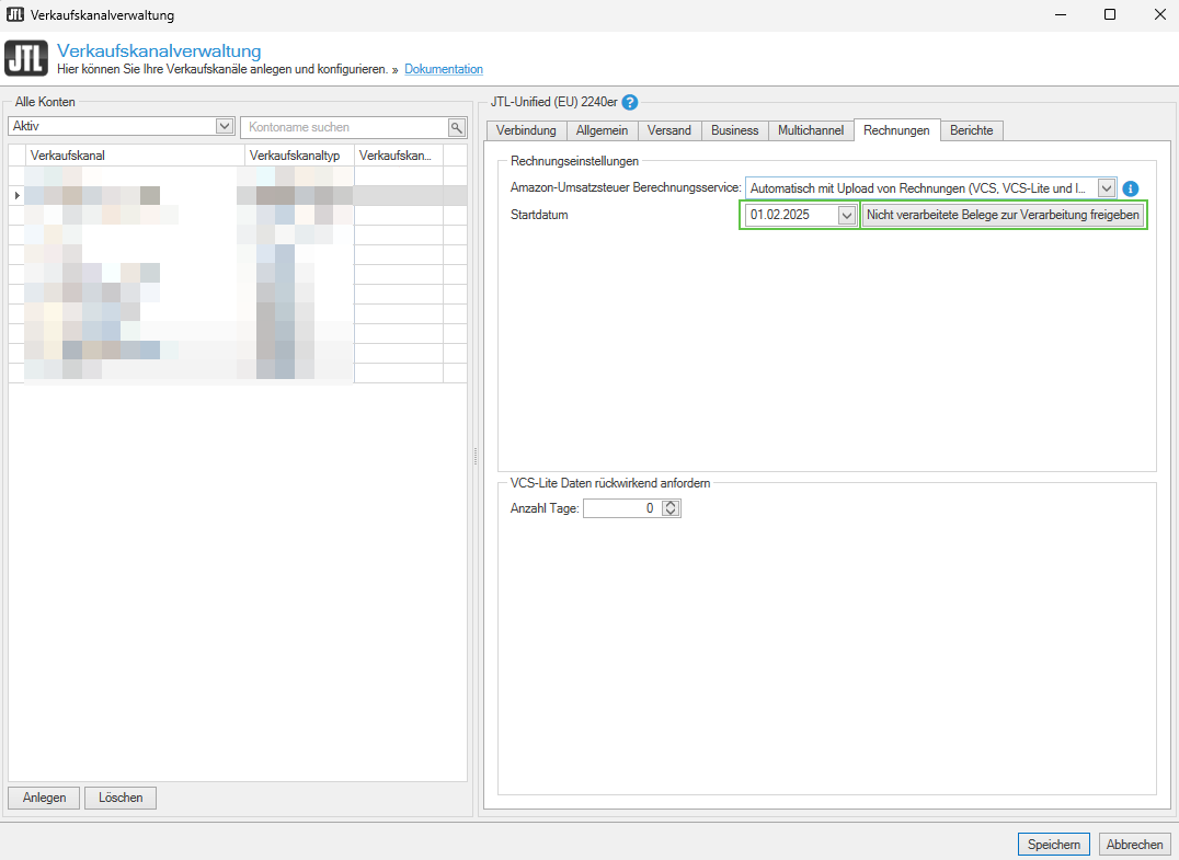 - Geben Sie ein Startdatum ein. Alle Belegdaten, die Amazon ab diesem Datum an JTL-Wawi erstellt hat, werden zur Verarbeitung freigegeben.