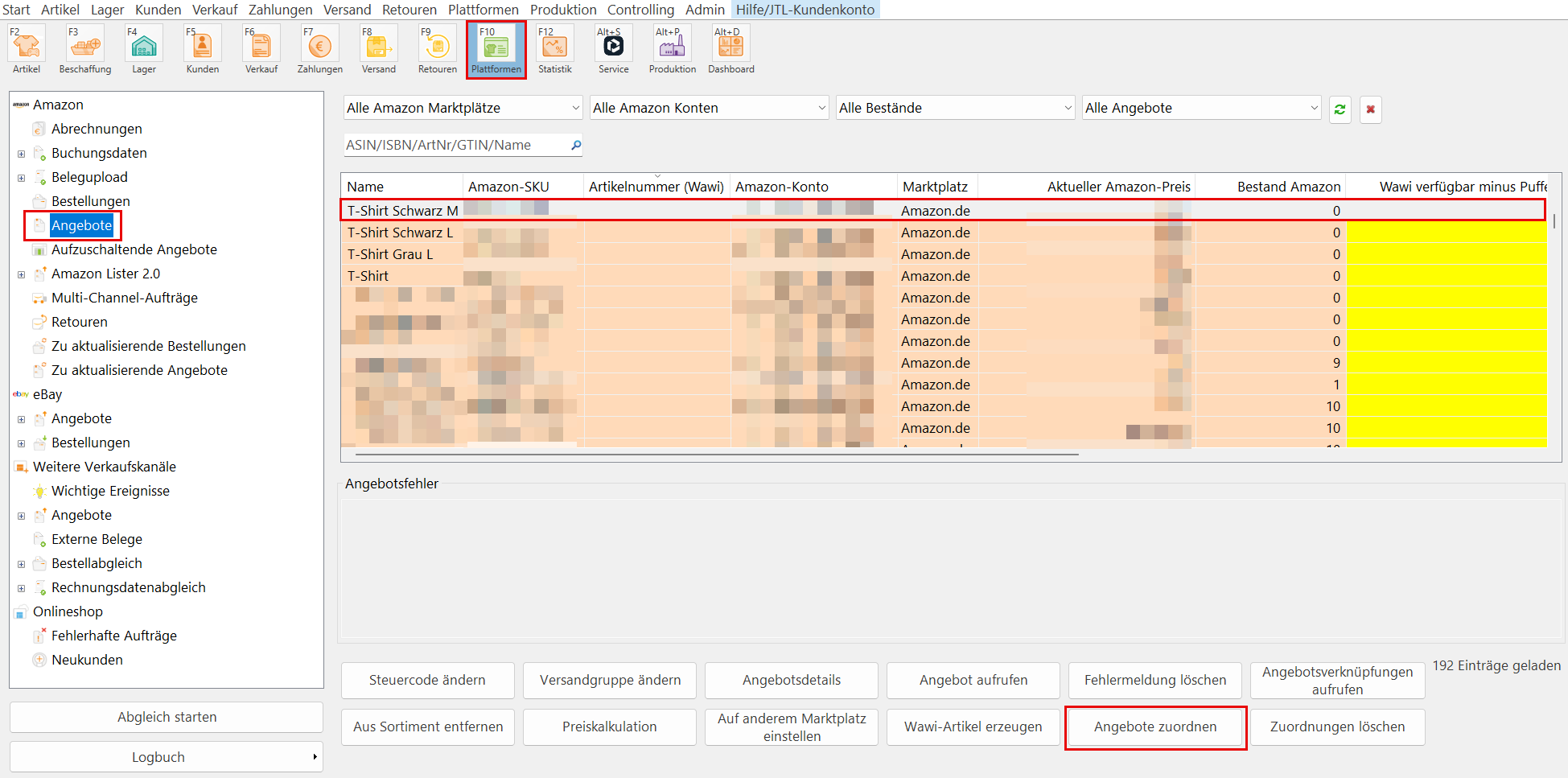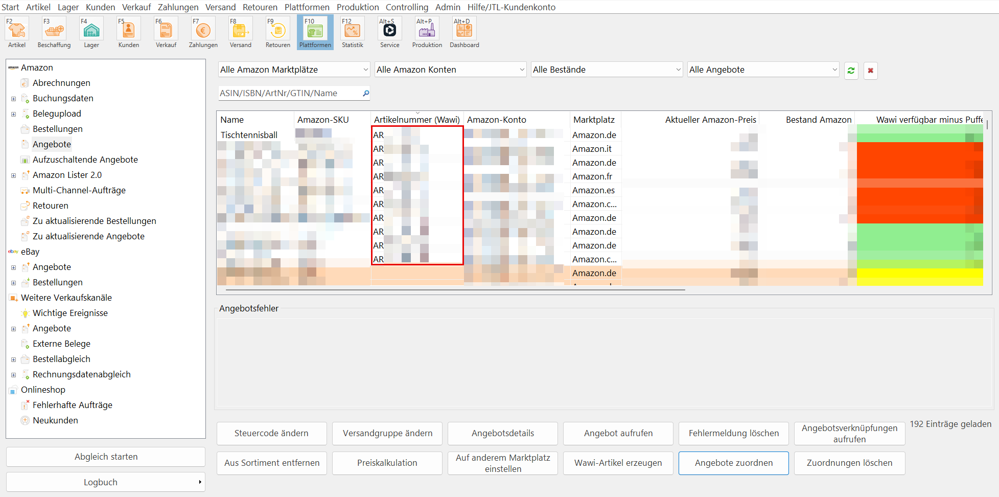 - Markieren Sie das Fremdangebot. Fremdangebote sind pfirsichfarben unterlegt. Außerdem ist die Spalte Artikelnummer (Wawi) neben der SKU des Amazon-Angebots leer.
