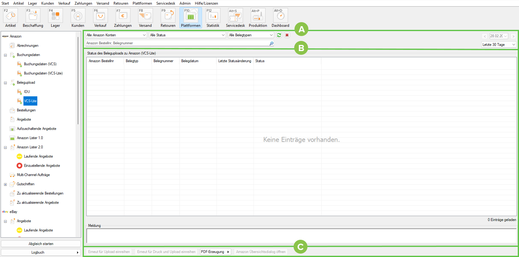 In dieser Dokumentation lesen Sie eine Detailbeschreibung der Funktionen im Ordner Amazon > Belegupload > VCS Lite. Sie erreichen den Ordner in JTL-Wawi über die Schaltfläche Plattformen.