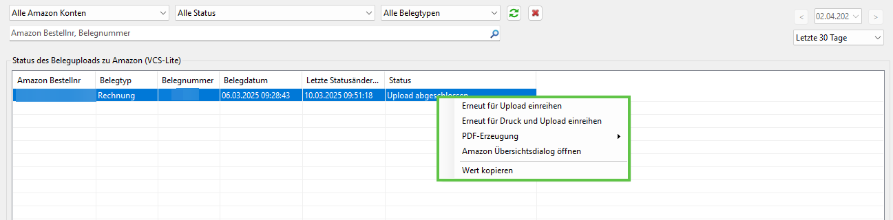 Erneut für Upload einreihen: Wählen Sie diese Option, um Belegdatensätze, für die eine PDF-Datei erstellt werden konnte, für einen neuen Upload-Versuch vorzumerken. JTL-Wawi versucht dann beim nächsten Abgleich, die Datei bei Amazon hochzuladen.