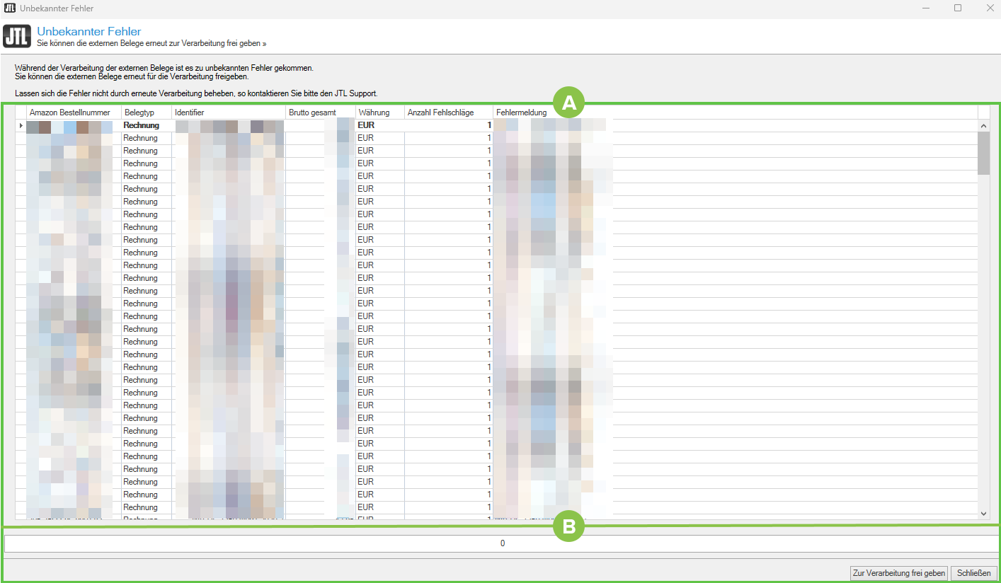 Das Dialogfenster Unbekannter Fehler zeigt eine Übersicht der Belege für Amazon Bestellungen, die nicht verarbeitet werden konnten. Das heißt: JTL-Wawi konnte entweder keinen Beleg erstellen oder konnte den Beleg nicht zu Amazon hochladen. In diesem Dialogfenster können Sie die Fehlermeldungen prüfen und Belege erneut zur Verarbeitung freigeben.