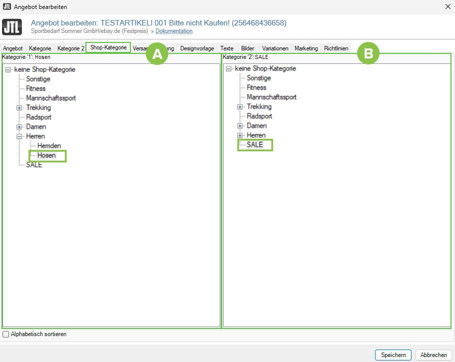 Alphabetisch sortieren: Aktivieren Sie diese Checkbox, um die Kategorien in den Bereichen Kategorie 1 und Kategorie 2 in alphabetischer Reihenfolge anzuzeigen. Bei vielen Kategorien hilft Ihnen die alphabetische Sortierung dabei, die gewünschten Kategorien zu finden. Die Reihenfolge der Kategorien in Ihrem eBay-Shop ändert sich durch diese Sortierung nicht.