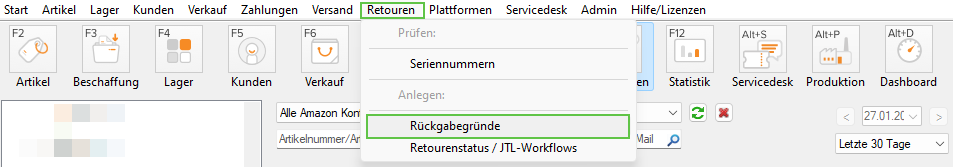 - Öffnen Sie das Menü Retouren > Rückgabegründe.