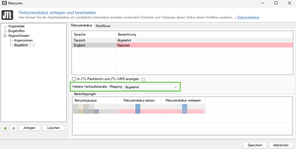 - Öffnen Sie über das Menü Retouren > Retourenstatus/JTL-Workflows das Dialogfenster Retourenstatus anlegen und bearbeiten.