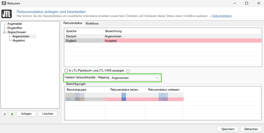 - Klicken Sie in der Baumstruktur links auf den Retourenstatus, den Sie für Retouren angelegt haben, die Sie annehmen. Wählen Sie in der Registerkarte Retourenstatus im Dropdown-Menü Weitere Verkaufskanäle – Mapping die Option Angenommen.