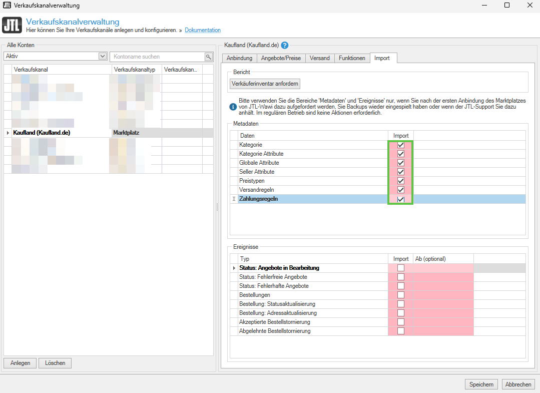 Fehlende Daten eines Verkaufskanals importieren (z.B. Kategorien, Versandregeln, Marktplatzfelder)