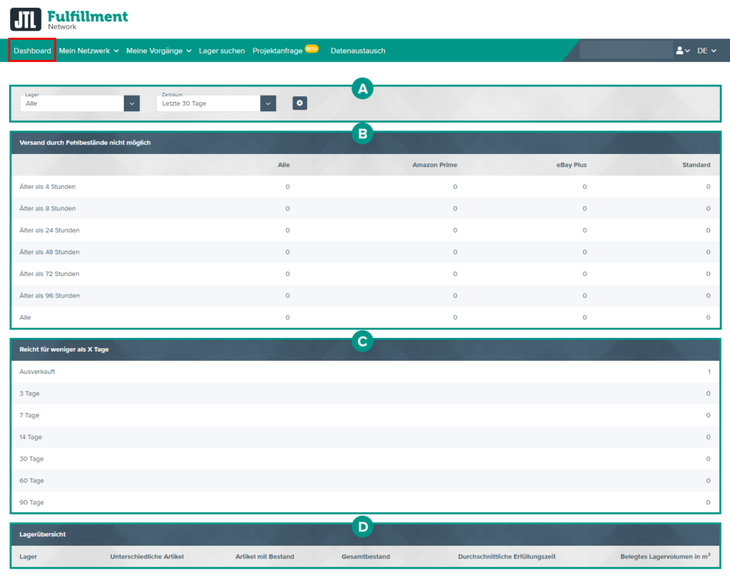 In dieser Dokumentation lesen Sie eine Detailbeschreibung des Dashboards. Sie erreichen das Dashboard in JTL-FFN über die Schaltfläche Dashboard.