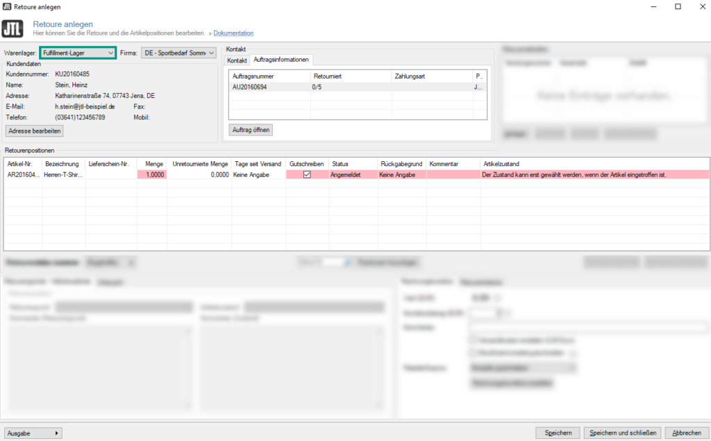 Sobald Sie eine Retoure anlegen und als Warenlager ein Lager aus dem JTL-Fulfillment Network auswählen, wird diese Retoure an den Fulfillment-Dienstleister des Lagers übertragen. Auch alle Änderungen werden mit dem FFN und Ihrem Fulfillment-Dienstleister synchronisiert.