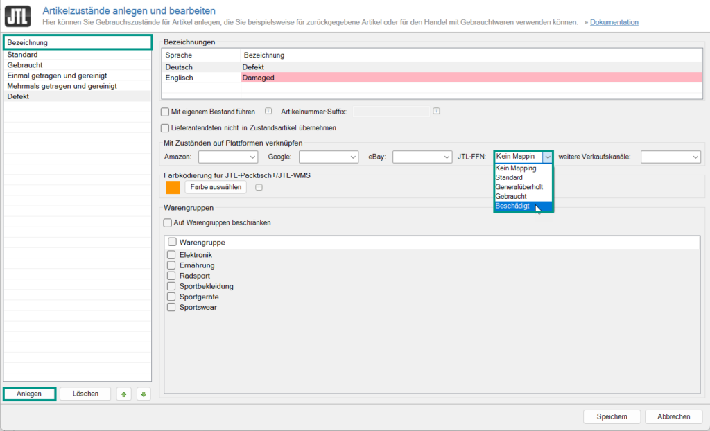 - Öffnen Sie in JTL-Wawi über das Menü Artikel > Artikelzustände das Dialogfenster Artikelzustände anlegen und bearbeiten.