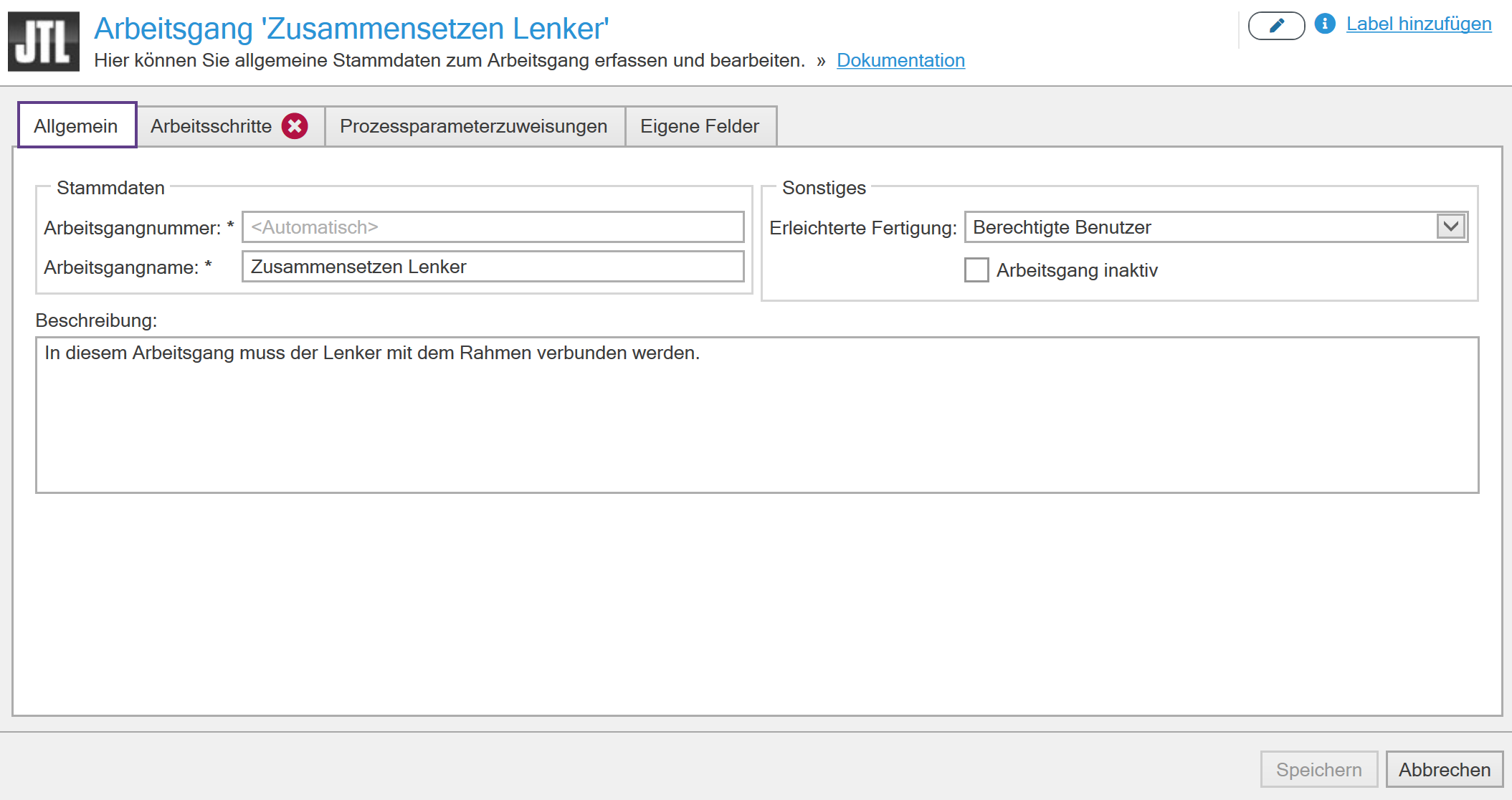 - Hinterlegen Sie bei Bedarf im Feld Beschreibung eine detaillierte Beschreibung des Arbeitsgangs.