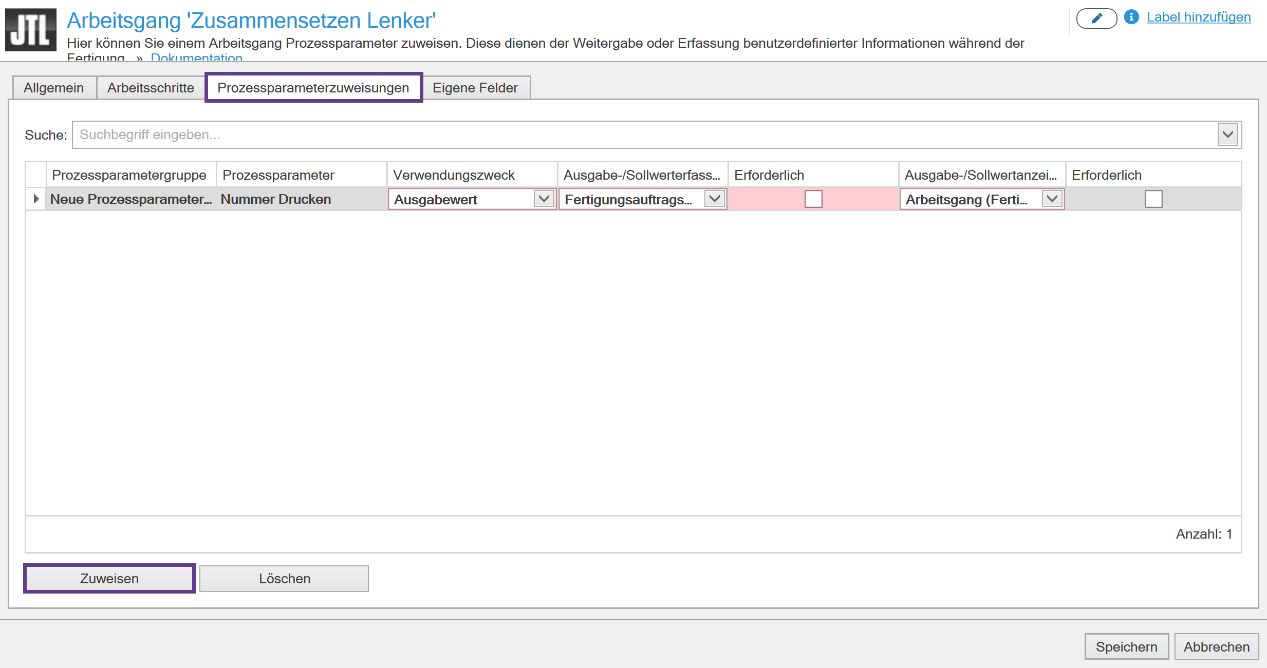 - Klicken Sie auf die Schaltfläche Zuweisen, wählen Sie die vorab angelegten Prozessparameter aus und bestätigen Sie Ihre Auswahl.