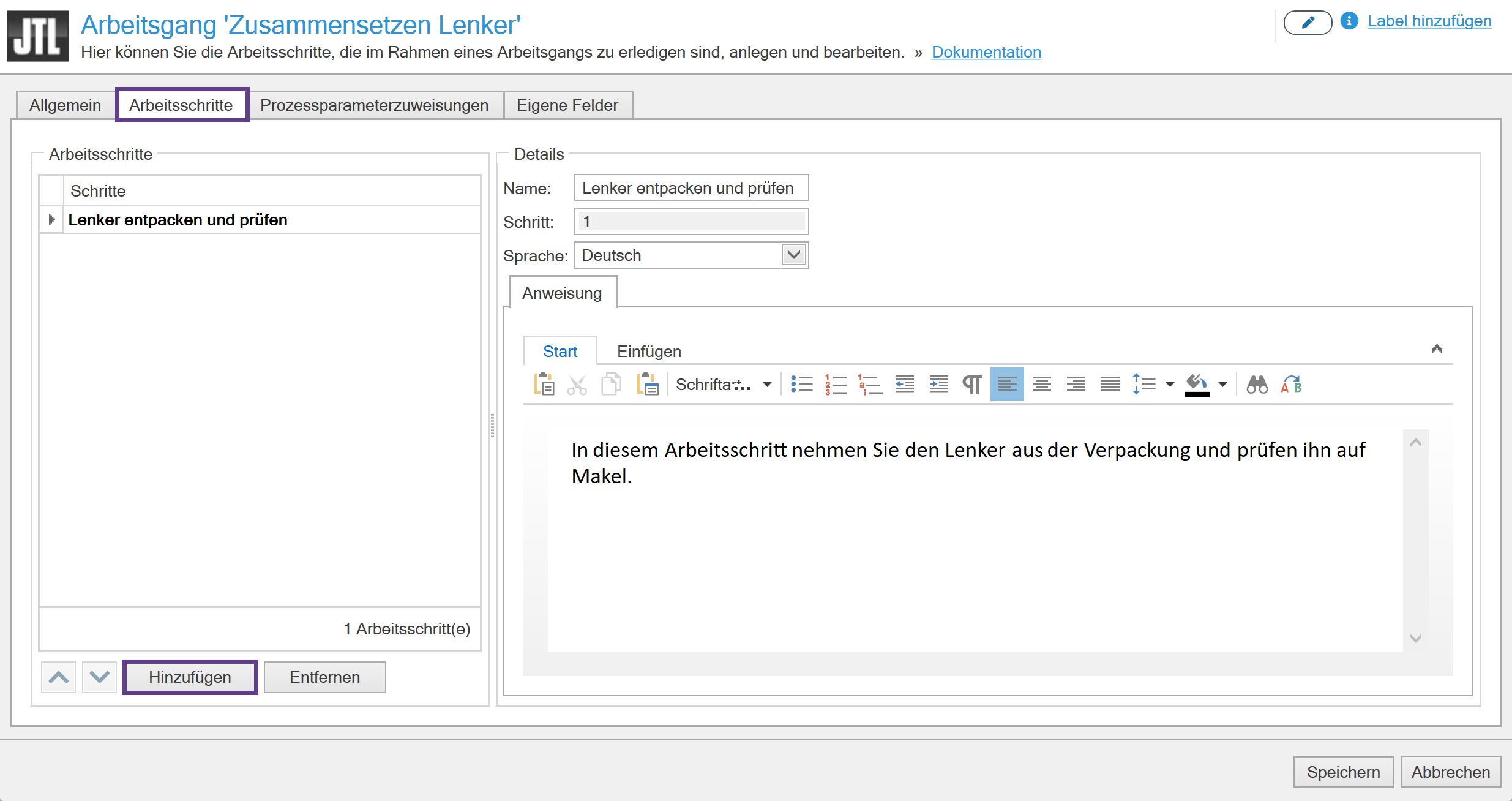 - Schreiben Sie in der Registerkarte Anweisung eine konkrete Handlungsanweisung für den Arbeitsschritt in das Textfeld. Diese Handlungsanweisung wird Ihren Mitarbeitenden später bei der Produktion in JTL-Workbench angezeigt.