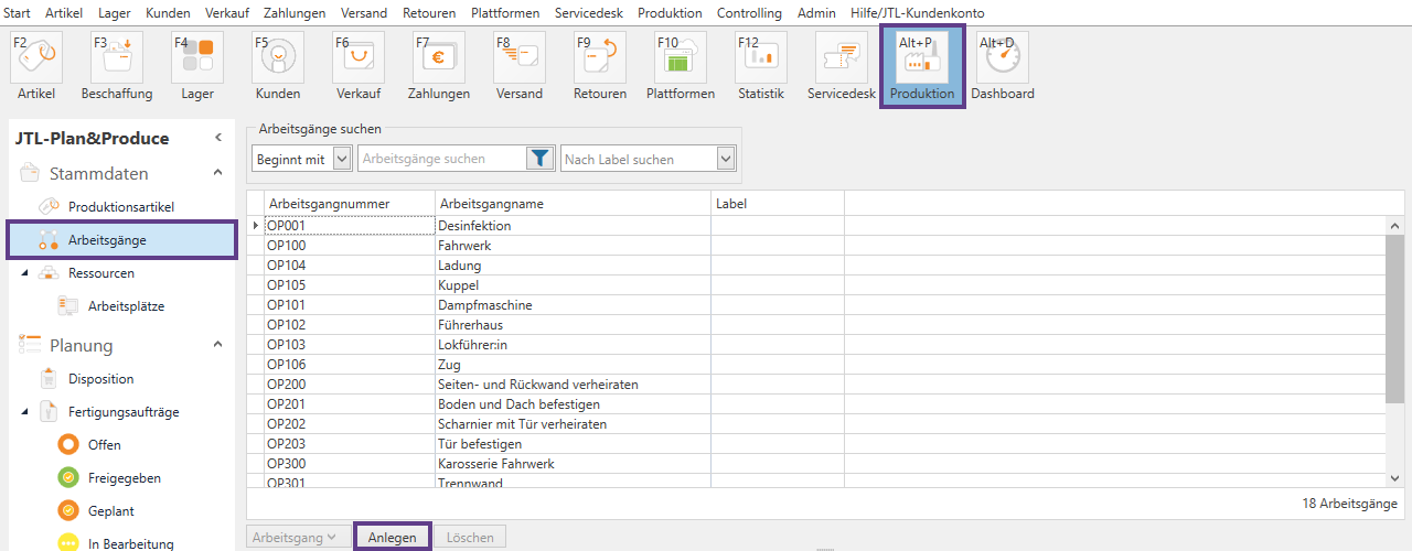 - Klicken Sie in JTL-Wawi auf die Schaltfläche Produktion. JTL-Plan&Produce öffnet sich.