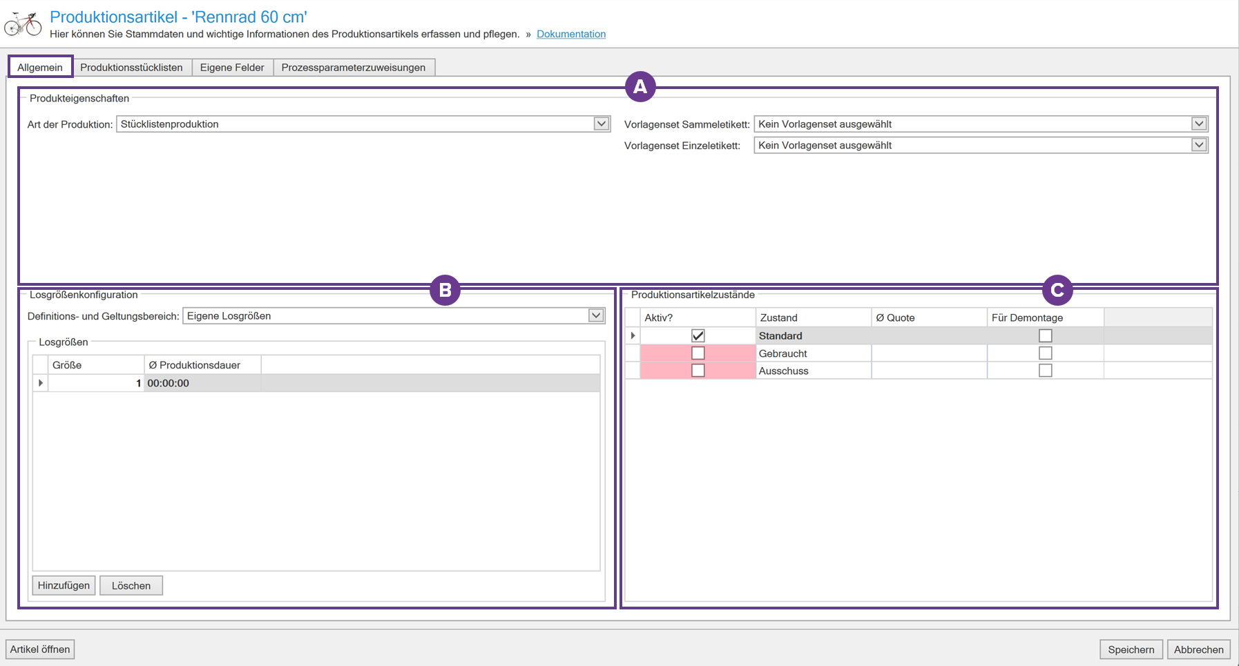 Aktiv?: Aktivieren Sie die Checkboxen der Produktionsartikelzustände, die Sie für den Produktionsartikel festlegen möchten.